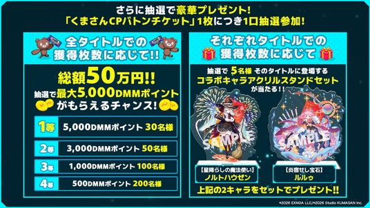 さらに!「くまさんCPバトンチケット」1枚につき一口抽選参加で、最大5,000DMMポイントや「コラボキャラアクリルスタンドセット」が当たるチャンス!