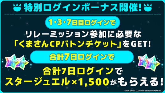 期間中「ティンクルスターナイツ」をプレイすると、ログイン日数に応じて「リレーミッション」の参加に必要な「くまさんCPバトンチケット」や最大スタージュエル×1,500がもらえます!