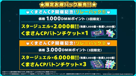 「リレーミッション」の参加に必要な「くまさんCPバトンチケット」や、スタージュエルがお得に手に入る特別な販売物になっておりますので、お見逃しなく!