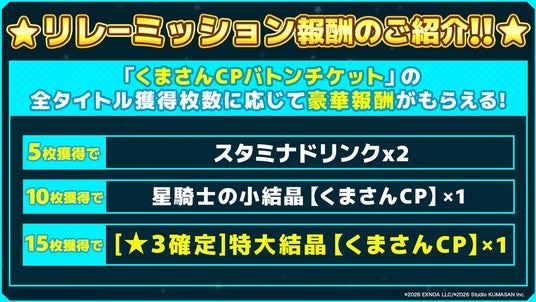 ※「ティンクルスターナイツ」でのリレーパックにて「くまさんCPバトンチケット」獲得が可能な期間は「3月19日(木)メンテナンス後 ~ 4月3日(金)23:59」までとなりますので、ご注意ください。