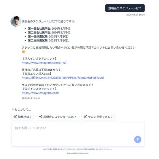 株式会社EyeUniverse(所在地:東京都港区、代表取締役:森越道大、以下「当社」)は、美容サロン向けAIプラットフォーム「iProducer Studio」の求人AIの提供を開始いたしました。