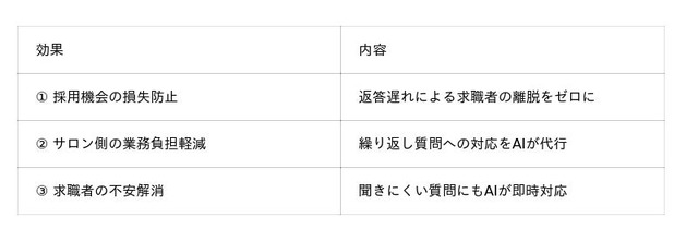 導入サロンおよび求職者からは、以下のような声が寄せられています。「細かな質問にAIが対応してくれるから、他の業務がはかどるようになった」