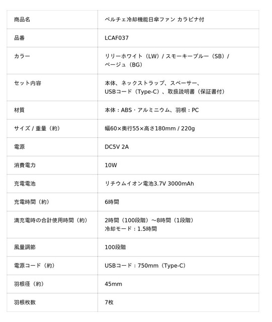 「ペルチェ冷却機能日傘ファン カラビナ付」LCAF037