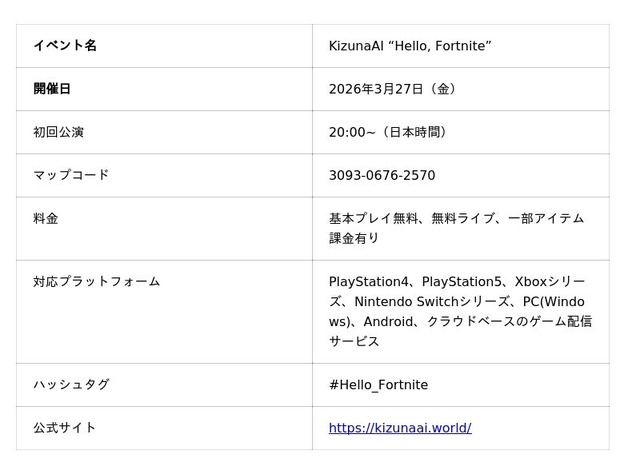 Kizuna AI株式会社(本社:東京都渋谷区、代表取締役:大坂武史)、Alche株式会社(本社:東京都渋谷区、代表取締役:川大揮、以下当社)は、共同で、Epic Gamesが提供する人気オンラインゲーム「FORTNITE(フォートナイト)」内の「Hello, Fortnite」において、世界初のバーチャルYouTuber、バーチャルタレント、Kizuna AI(キズナアイ)の無料のインゲームコンサート(ゲーム内での音楽ライブ) を2026年3月27日(木)20時より開催いたします。