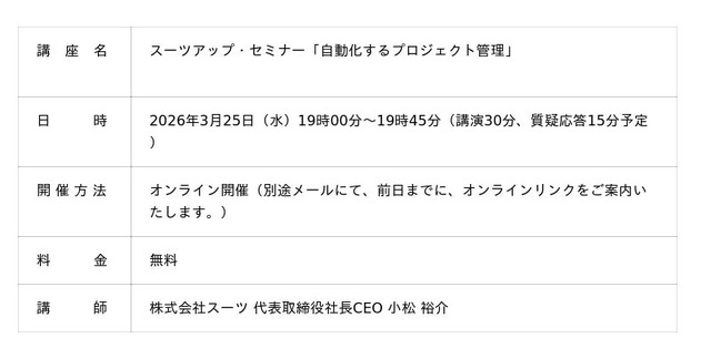 当社では、2026年3月25日(水)19時から、当社代表の小松が講師を務めるスーツアップ・セミナー「自動化するプロジェクト管理」を無料開催します。