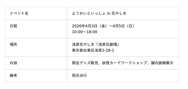 園内では、描き下ろしデザインを使用したステッカー、トレーディングカード、クリアカード、ゆらゆらチャームなどのイベント限定グッズを販売します。また、連動企画としてオリジナル御朱印帳を使ったスタンプラリーや、「みんなでつくる妖怪カード」ワークショップも展開し、来場者が妖怪の世界をより深く楽しめる体験型コンテンツを用意しています。