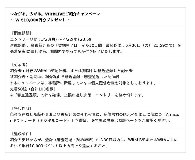 1対1のライブトークプラットフォーム「WithLIVE」を運営する株式会社WithLIVE(本社:東京都港区、代表取締役:大島翼)は、2026年3月23日(月)より、個人配信者を対象とした「つながる、広がる。WithLIVEご紹介キャンペーン ― Wで10,000円分プレゼント ―」を実施いたします。
