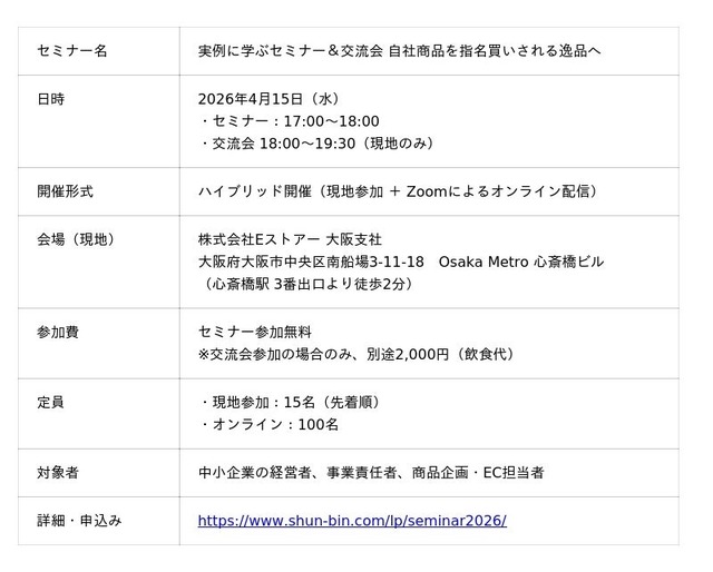 シュンビン株式会社(京都府伏見区 代表取締役社長:津村元英 証券コード:203A)は、「中小企業の企画部を代行する」をミッションに掲げ、お客様のお悩みをクリエイティブの力によって解決し、共に育てる伴走型のサービスを提供する会社です。この度、株式会社Eストアー(本社:東京都港区、以下Eストアー)と共同で、無料共催セミナー『実例に学ぶセミナー&交流会 自社商品を指名買いされる逸品へ』を開催いたします。本セミナーでは、商品開発とEC運用という、直販に不可欠な両輪のノウハウを一度に提供することで、中小企業の収益構造改善を加速させることを目指します。