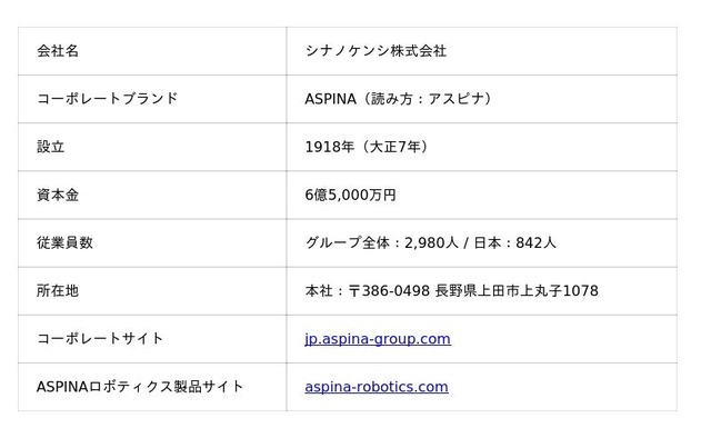 ASPINA(シナノケンシ株式会社)は、1918年に創立し、「世界中の人々の希望と快適をカタチにし、持続可能な社会の実現に貢献します」という提供価値のもと、精密モータ、アクチュエータ、ロボティクス製品などを開発・製造する企業グループです。自動化、医療、車載、宇宙などの分野で、研究開発から営業、製品設計、生産、サービスまでグローバルなネットワークを構築し、世界中のお客様のニーズに合わせた幅広いソリューションを提供しています。