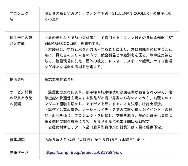 令和7年度HATSU起業家支援プログラム(鎌倉拠点(HATSU鎌倉))チャレンジャー。前職の自動車メーカーでは、エンジニア及び新規事業開発を経験。趣味のバイク走行時の気付きを原点に、既存市場では見当たらない冷却機能と利用者の快適性を実現する製品を開発・販売するため、令和7年5月に横浜市内に「豪志工業株式会社」を設立。