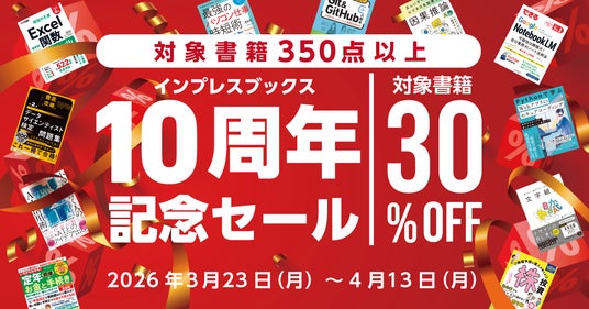 2016年4月にサービスを開始したインプレスブックスは10周年を迎えます。長年のご愛顧に感謝して「インプレスブックス 10周年記念セール」を実施いたします。セール対象の電子書籍タイトルは350点以上で、PC書、プログラミング書、ビジネス書からデザイン書までインプレスの人気商品を豊富にラインナップしています。対象タイトルは通常30%OFFに加え、10周年記念クーポンを併用すると最大51%OFFとなる大変お得なセールです。