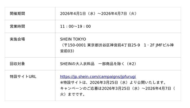 この度、第21弾『#SHEIN Again』を2026年4月1日(水)~2026年4月7日(火)に開催いたします。参加にあたっては、応募ページ(https://jp.shein.com/ark/5710)から事前にお申し込みいただき、あわせてSHEIN公式LINEアカウント(https://page.line.me/142khvkx)を友だち追加してください。その後、「SHEIN TOKYO」へ古着をご持参いただき、店頭でキャンペーンにご参加いただきます。本キャンペーンでは、SHEINでご購入いただき不要となった大人衣料品をお持ちいただいた場合に、代わりにお持ち帰りいただけるアイテム(洋服、シューズ、バッグなど)をご用意(期間中、お一人様1回限りのご参加、最大3点まで)しております。さらに、『#SHEINAgain』を付けてInstagramやXにご投稿いただくと、追加でもう1点のアイテムを交換でき、最大4点のアイテムをゲットすることができます(※1)。着なくなったSHEINの洋服を寄付し、新しい商品をゲットしてみませんか?