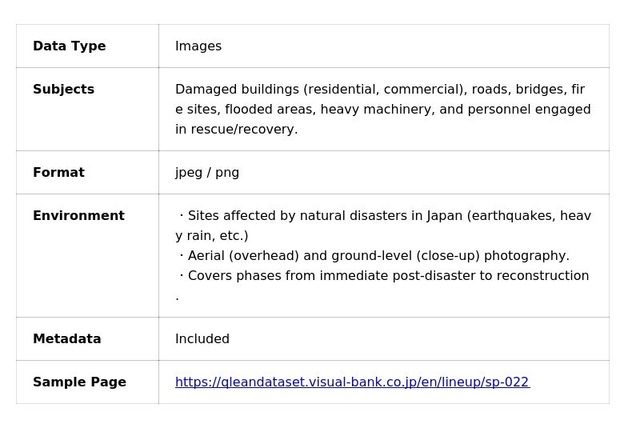 Visual Bank Inc. (Minato-ku, Tokyo; Saneyuki Nagai, Representative Director and CEO), through its subsidiary amana images inc., has announced the release of the "Japan Natural Disaster Image Dataset." This dataset is part of their AI training data solution, "Qlean Dataset," and is specifically optimized for training Large Multimodal Models (LMMs) and improving image recognition accuracy in complex disaster scenarios.