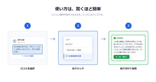 口コミを選択して右クリックするだけ。3ステップで返信案が完成