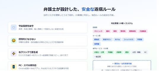 クリニック、歯科、飲食店、美容サロン、ホテル、不動産、士業など、19業種それぞれに最適化された返信ルールを搭載しています。さらに、事業者独自のルール(例:「当院は小児科なので、お子様に関する記述は一切しない」)をカスタム設定することも可能です。