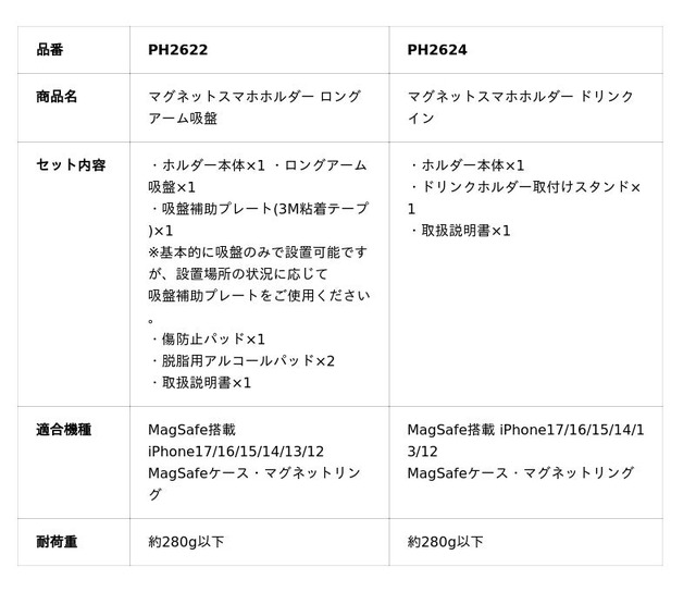 株式会社ペルシードは、スマートフォンをマグネットで簡単に固定できる車載スマートフォンホルダー2種、「マグネットスマホホルダー ロングアーム吸盤(PH2622)」と「マグネットスマホホルダー ドリンクイン(PH2624)」を2026年2月に全国のカー用品店およびECサイトにて発売いたしました。(オープン価格)