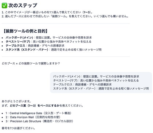 対話で条件を整理し、ブース外観3案を画像で共有したうえで、選んだ世界観に沿って装飾ツールをアイテムごとに3案ずつ画像化し、検討を一気通貫で進められる。