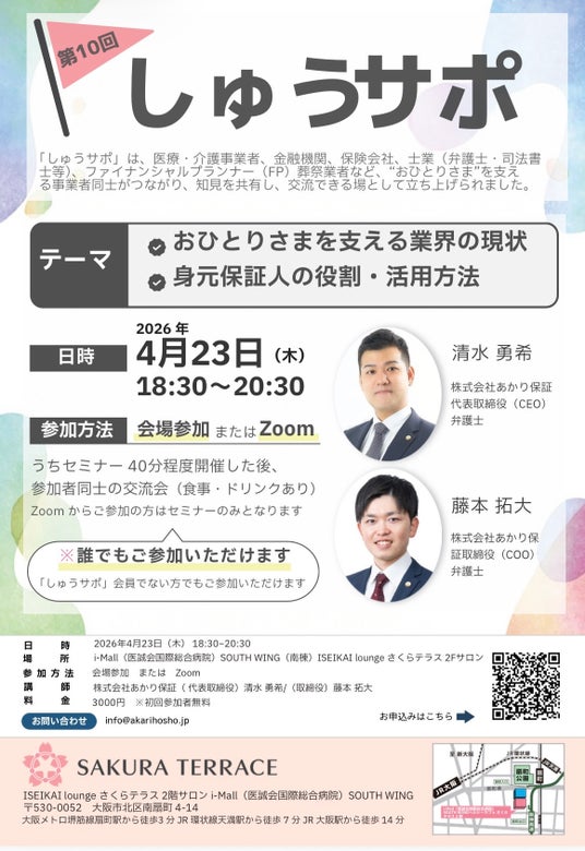 会場:〒530-0052大阪府大阪市北区南扇町4-14 i-Mall(医誠会国際総合病院)SOUTH WING(南棟)ISEIKAI loungeさくらテラス2F サロン