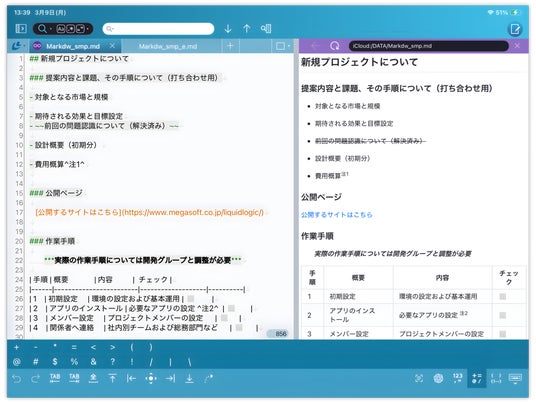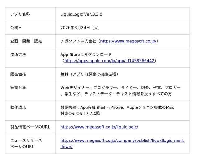 メガソフト株式会社(本社:大阪府大阪市、代表取締役:井町良明)は、2019年5月より公開しているiOS用テキスト編集アプリ「LiquidLogic」において、Markdownファイルのプレビュー機能を追加した最新版を公開しました。