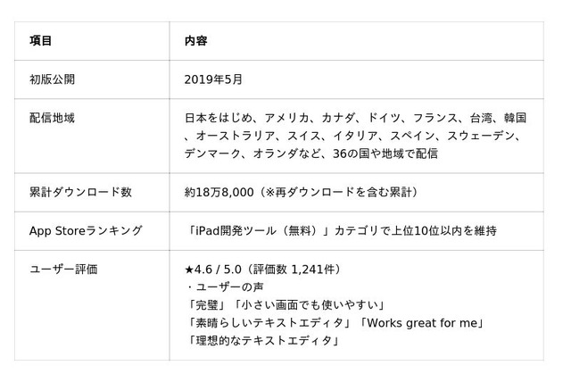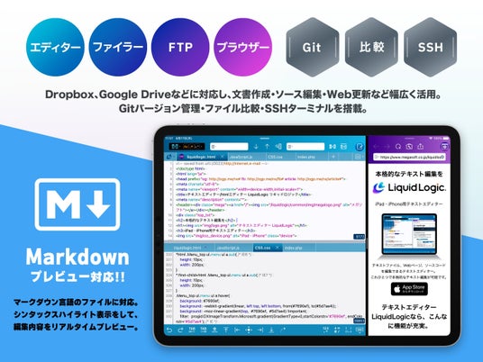 LiquidLogicは、同社のパソコン用テキストエディタ「MIFES(マイフェス)」の流れを汲みつつ、ファイラーやFTP機能を搭載し、クラウドやサーバー上のファイルを編集できるほか、専用ブラウザーでWebプレビューも可能なiPad/iPhone向けの高機能テキストエディターとして、2019年5月にリリースされました。世界36の国と地域で配信され、総ダウンロード数は約18万8,000に達し、ユーザー評価は★4.6(5段階、1,241件)と高い評価を得ています。その後も、SSHターミナル、Gitバージョン管理、ファイル比較、ChatGPT機能、英語対応など、着実に機能の拡充とユーザーの拡大に努めてきました。