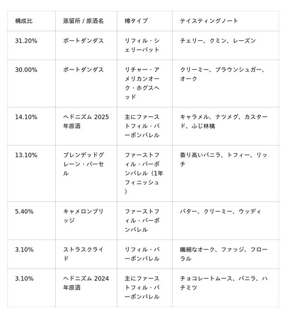 - 希少な原酒構成: ポートダンダス蒸留所のリフィルシェリーバット(31.2%)を中心に、ストラスクライドやキャメロンブリッジの古酒を含む、全7種の貴重な原酒を贅沢に使用しています。