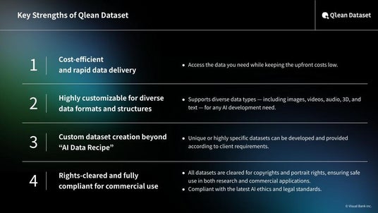 Qlean Dataset is a commercially cleared AI training data solution provided by Amana Images, a subsidiary of Visual Bank Group. The platform offers diverse data formats including image, video, audio, 3D, and text, as well as a specialized AI Data Recipe lineup developed through collaborations with major media organizations and data rights holders.