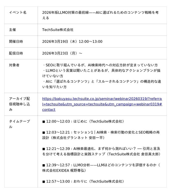 TechSuite株式会社(テックスイート/代表取締役: 畠山夏輝)は、2026年3月19日(木)に開催された、株式会社グランネット、株式会社EXIDEAとの3社共催ウェビナー「2026年版LLMO対策の最前線--AIに選ばれるためのコンテンツ戦略を考える」のアーカイブ配信を開始いたしました。