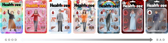 ・ 健康状態を視覚化する「もうひとりの自分」:健康診断書の「機能別判定」のうち、「血液一般、肝機能、心電図、胸部X線、腎・泌尿、胃部X線」のA~E判定に応じて、該当の臓器フィギュア・パッケージデザインが変化し、自分の健康状態を直感的に理解できるビジュアルが生成されます。