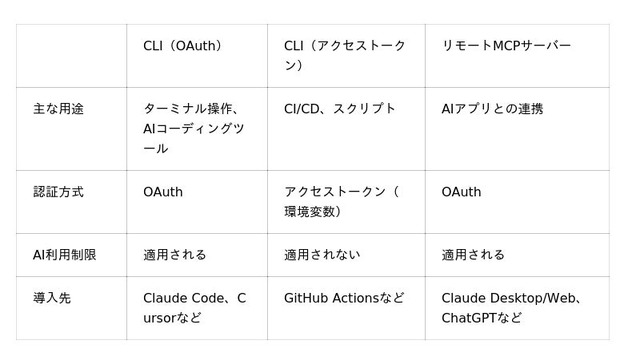 - OAuth認証(対話的利用向け)とアクセストークン認証(CI/CD向け)の2方式に対応