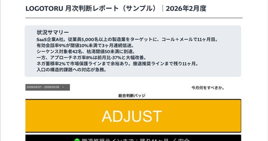 月次判断レポートサンプル ― 毎月届く「続けるか、止めるか、変えるか」の根拠LOGOTORUでは毎月、クライアントにこの判断レポートを納品しています。レポートは50指標、6セクションで構成されます。