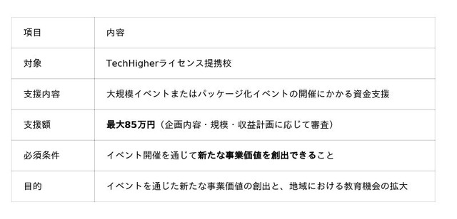 10代向けデジタル人材育成サービス『TechHigher』を運営する株式会社エクシード(本社:東京都渋谷区、代表取締役:澤部愛子)は、ライセンス提携校が主催するイベントを支援する「イベント開催支援制度」を大幅に拡充し、新たに最大85万円を支給する枠組みを開始いたしました。本制度の拡大により、イベント開催を通じて新たな事業価値を創出できる「大規模イベント」および「パッケージ化イベント」の開催を強力に後押しし、地域における教育活動のさらなる活性化を目指します。