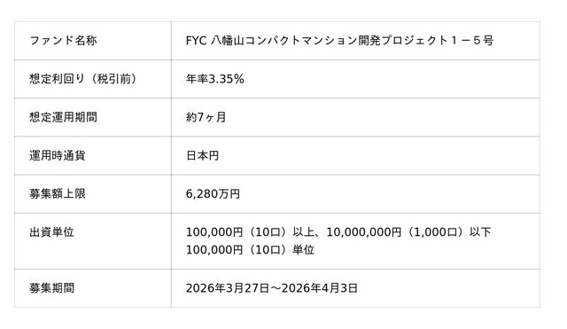 「未来をわかちあう投資」を提供する「Funvest(ファンベスト)」(以下、Funvest)は、「FYC 八幡山コンパクトマンション開発プロジェクト1-5号」(以下、本ファンド)の募集を3/27より開始しますので、お知らせいたします。