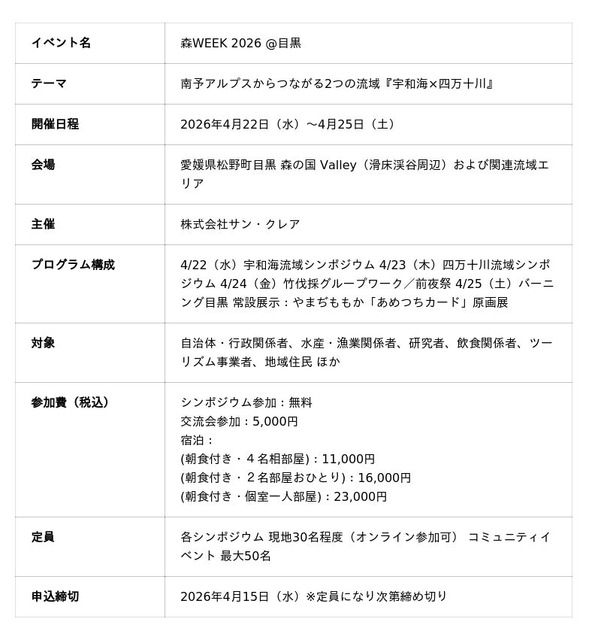 株式会社サン・クレア(本社:広島県福山市、代表取締役:細羽雅之)は、2026年4月22日(水)から25日(土)までの4日間、愛媛県松野町目黒・滑床渓谷を拠点に、総合イベント「森WEEK 2026 @目黒」を開催いたします。 本イベントは、南予アルプスを源とする「宇和海」と「四万十川」という2つの流域をテーマに据え、シンポジウム、フィールドワーク、コミュニティイベント、展示を通じて、自然と人の共生のあり方を実践的に探究する試みです。 多様な主体が一堂に会し、知見を交わしながら「共生のこれから」を探究する創造的なプラットフォームを目指します。