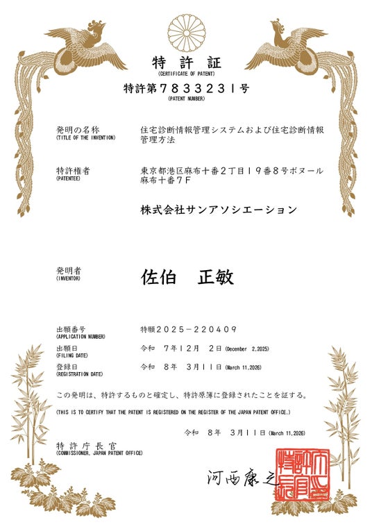 戸建て住宅の不動産売買および保全・メンテナンス事業を展開する株式会社サンアソシエーション(本社:東京都港区、代表取締役:佐伯正敏)は、スマートフォンを利用して点検・修繕履歴をデジタルデータとして蓄積・証明できる「住宅診断情報管理システム」において、ビジネスモデル特許を取得いたしました(特許第7833231号)。