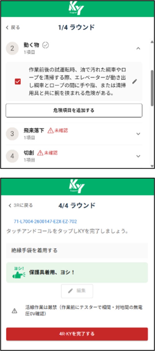 ・KY活動の基本手法である「4ラウンド法(現状把握・本質追求・対策樹立・目標設定)」のステップをアプリケーション内で再現しています。画面の案内に沿った操作で、ステップを省略することなく確実に実施し、初心者からベテランまで、標準化した質の高い安全確認を実施できます。