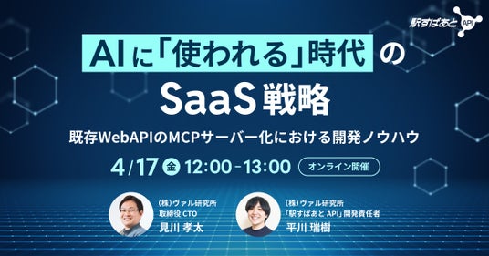 「AIに使われるシステム(SoA)への転換」をテーマに、当社CTOと「駅すぱあと API」プロダクトオーナーによる、オンラインセミナーを開催します。AIエージェントの進化により今後SaaSのビジネスモデルはどうなっていくのか、また、既存のWebAPIをMCPサーバー化する過程で得られた開発ノウハウなど、当社エンジニアの見解や開発ナレッジを共有します。