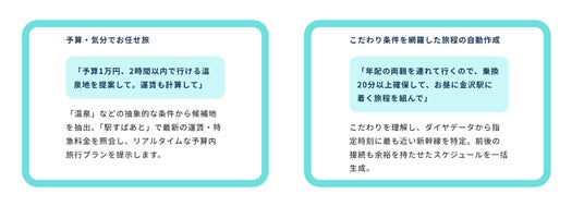 旅行サービスAIエージェントと連携することで、AIがユーザーの好みや周辺情報と公共交通の時刻表データを組み合わせ、より自由の高い正確な旅程を簡単に作成することも可能です。