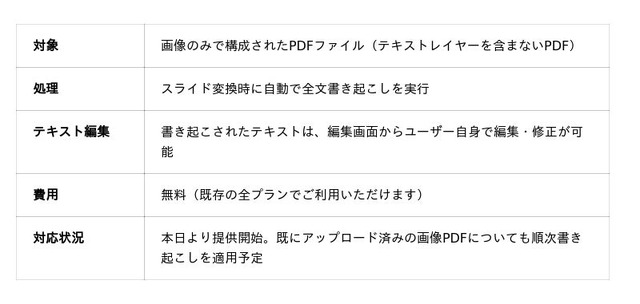 近年、NotebookLMをはじめとするAIツールの普及により画像ベースのスライドが増加していることを受け、これらのPDFについてもテキストを正しく認識・書き起こしできるよう、本機能の開発に至りました。