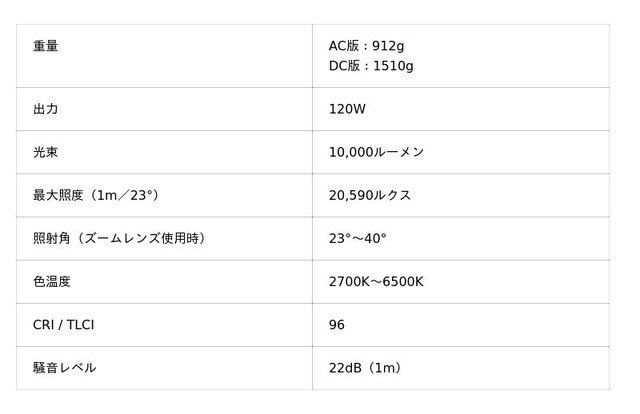 光量を5.5倍に高め、10,000ルーメンの光を効率よく集光することで、1mで最大20,590ルクスという高い照度を実現しています。