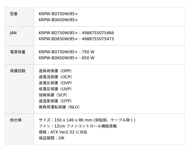PCパーツブランド「玄人志向」は、80PLUS BRONZE認証のATX電源『KRPW-BDシリーズ』を発売いたします。