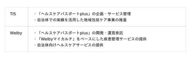 「ヘルスケアパスポートplus」の提供により、患者が症状を認識してから受診・診断・治療・セルフケアに至るまでの一連の体験や行動の流れを表すペイシェントジャーニーにアプローチできる機能の強化と、医療機関をはじめとする地域の施設を網羅したPHRネットワークの形成を目指します。今回の事業推進にあたって、TISとWelbyは共同でサービス企画・運営に取り組み、自治体・医療機関へ展開します。「ヘルスケアパスポートplus」の開発は、TISが展開する「ヘルスケアパスポート」の機能を強化する形で進め、その開発・運営をWelbyが担い、TISがサービスを提供します。