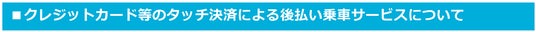 お手持ちのクレジットカード等をそのまま自動改札機にタッチして乗車するサービスです。詳細は下記URLよりご確認ください。