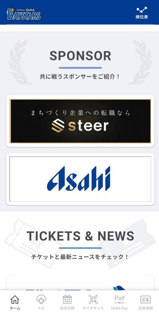 ■ 横浜DeNAベイスターズ公式アプリへのバナー掲載について2026年3月27日より、横浜DeNAベイスターズ公式アプリにsteer株式会社のバナー広告の掲載を開始いたしました。
