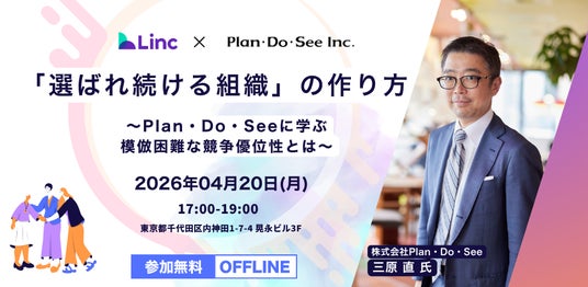 「日本に来てよかった」を最大化することをミッションに、外国人材の採用・定着支援AIプラットフォーム「Global Hub(グロハブ)」を展開する株式会社Linc(本社:東京都千代田区、代表取締役:仲 思遥、以下「当社」)は、2026年4月20日(月)、数多くの人気ホテル・レストランを運営する株式会社Plan・Do・Seeの新卒第1期生であり、同社を「Great Place to Work(R) 日本TOP3」へと導いた三原直氏を招聘し、サービス業における本質的な組織変革をテーマとしたセミナーを開催いたします。