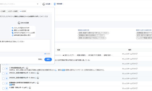 AI IPGenius on IDX は、報告書、評価書、調査資料、議事録などの非構造データを一元的に蓄積し、AIによる検索・要約・解析を可能にする知の資産化ナレッジベースである。