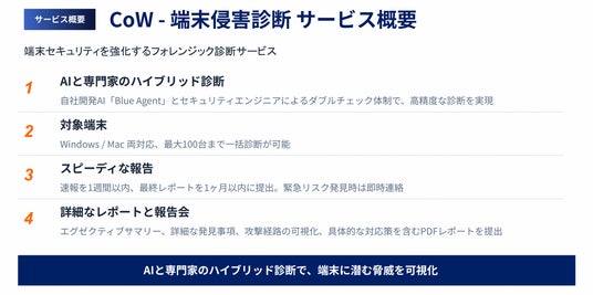 本サービスでは、自社開発AIによるフォレンジック解析とセキュリティ専門家のレビューを組み合わせ、企業端末に潜む侵害の痕跡を可視化します。ソフトウェアサプライチェーン攻撃の調査に加え、AIエージェント利用に伴う情報漏洩リスクの検出にも対応しており、速報レポートは1週間以内に提出可能です。