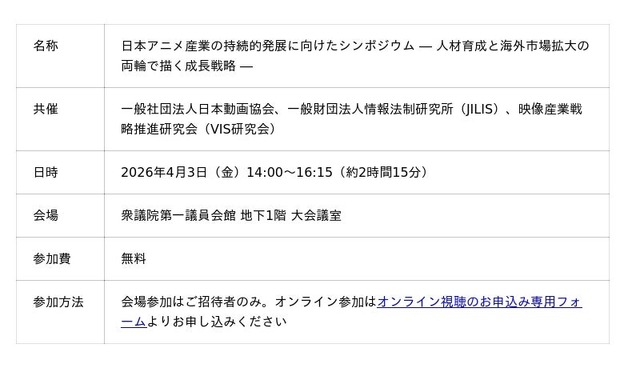 一般社団法人日本動画協会、一般財団法人情報法制研究所(JILIS)、映像産業戦略推進研究会(VIS研究会)は、2026年4月3日(金)に衆議院第一議員会館にて「日本アニメ産業の持続的発展に向けたシンポジウム ― 人材育成と海外市場拡大の両輪で描く成長戦略 ―」を開催いたします。市場規模3兆3,800億円超に成長した日本アニメ産業の構造的課題に対し、業界トップの経営者と政策立案者が集結し、骨太の方針への反映を念頭に置いた具体的な政策提言を行います。オンライン参加は無料で、どなたでもお申し込みいただけます。