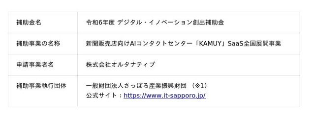 株式会社オルタナティブ(本社:北海道札幌市、代表取締役:谷藤亮子、以下 当社)は、一般財団法人さっぽろ産業振興財団(以下 財団)が実施する「令和6年度 デジタル・イノベーション創出補助金(※1)」(以下 本事業)において、当社の申請内容が採択され、支援対象事業として「新聞販売店向けAIコンタクトセンター KAMUY」の開発および実証実験を完了したことをお知らせします 。