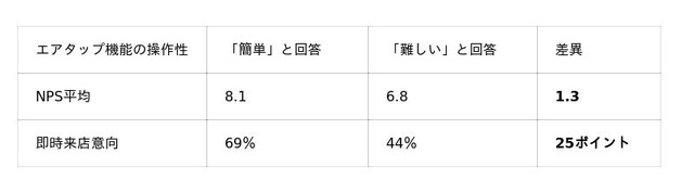 また、操作性について「簡単」と回答した人と「難しい」と回答した人のNPS平均は1.3の開き、即時来店意向には25ポイントの開きがあり、操作性の改善によって全体数値の大幅改善が見込まれることがわかりました。