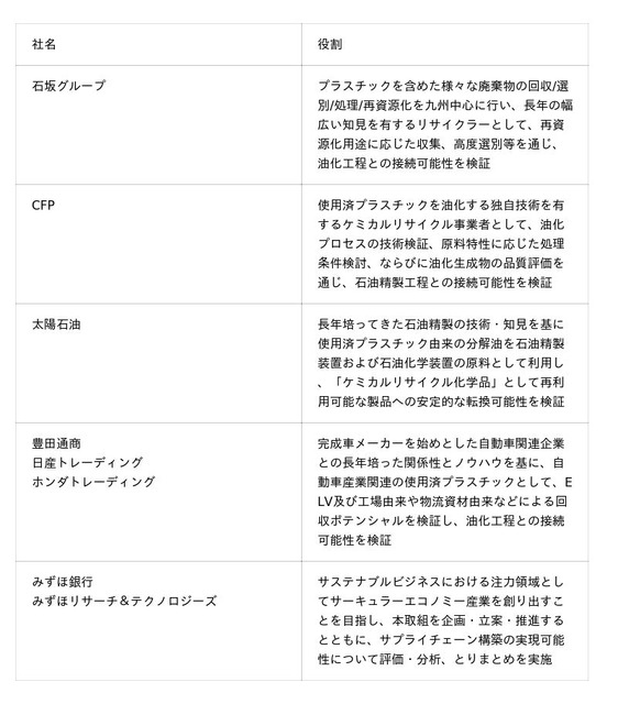 このたび、株式会社ホンダトレーディング(代表取締役 社長執行役員:夏目 達也)は、株式会社みずほ銀行(頭取:加藤 勝彦)、みずほリサーチ&テクノロジーズ株式会社(取締役社長:吉原 昌利)が企画・推進する取り組みに参画し、有価物回収協業組合石坂グループ(代表理事:石坂 孝光)、株式会社CFP(代表取締役:福田 奈美絵)、太陽石油株式会社(代表取締役社長:山本 堯大)、豊田通商株式会社(代表取締役社長:今井 斗志光)、日産トレーデイング株式会社(代表取締役社長兼CEO:石井 毅)とともに、プラスチックのサーキュラーエコノミー実現に向けた取り組みの一環として、九州を中心にケミカルリサイクルを活用したプラスチックリサイクルのサプライチェーン構築の実現可能性について共同研究を実施しました。